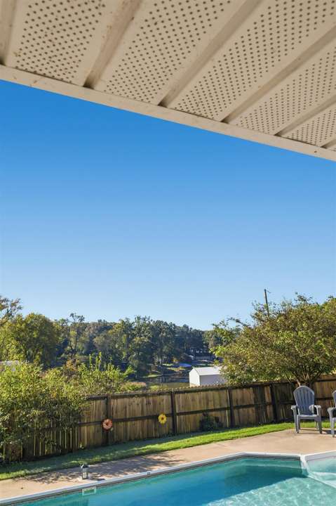 Charming 3-bedroom, 2 full bath home perfectly situated on a spacious lot overlooking the peaceful Donegan Slough. Offering both comfort and character this property blends serene water views with easy quiet living. Enjoy mornings in the sunroom or step out into the private backyard complete with inground pool (new pump in 2024 and new liner in 2023)! Large pantry provides ample storage and organization. Home also offers a safe room/storm shelter in the garage for added peace of mind and an exterior utility building for extra storage! Must see!