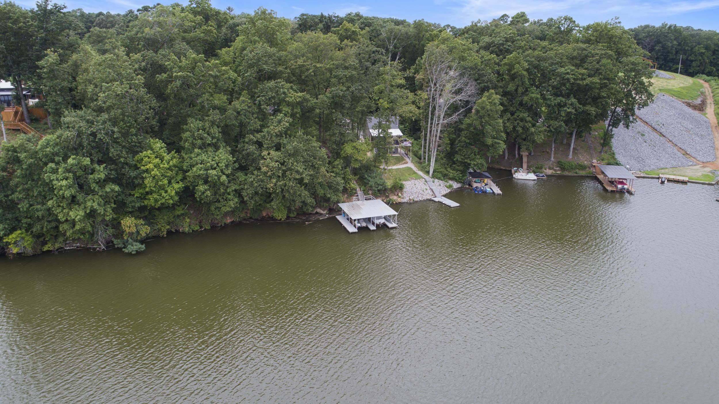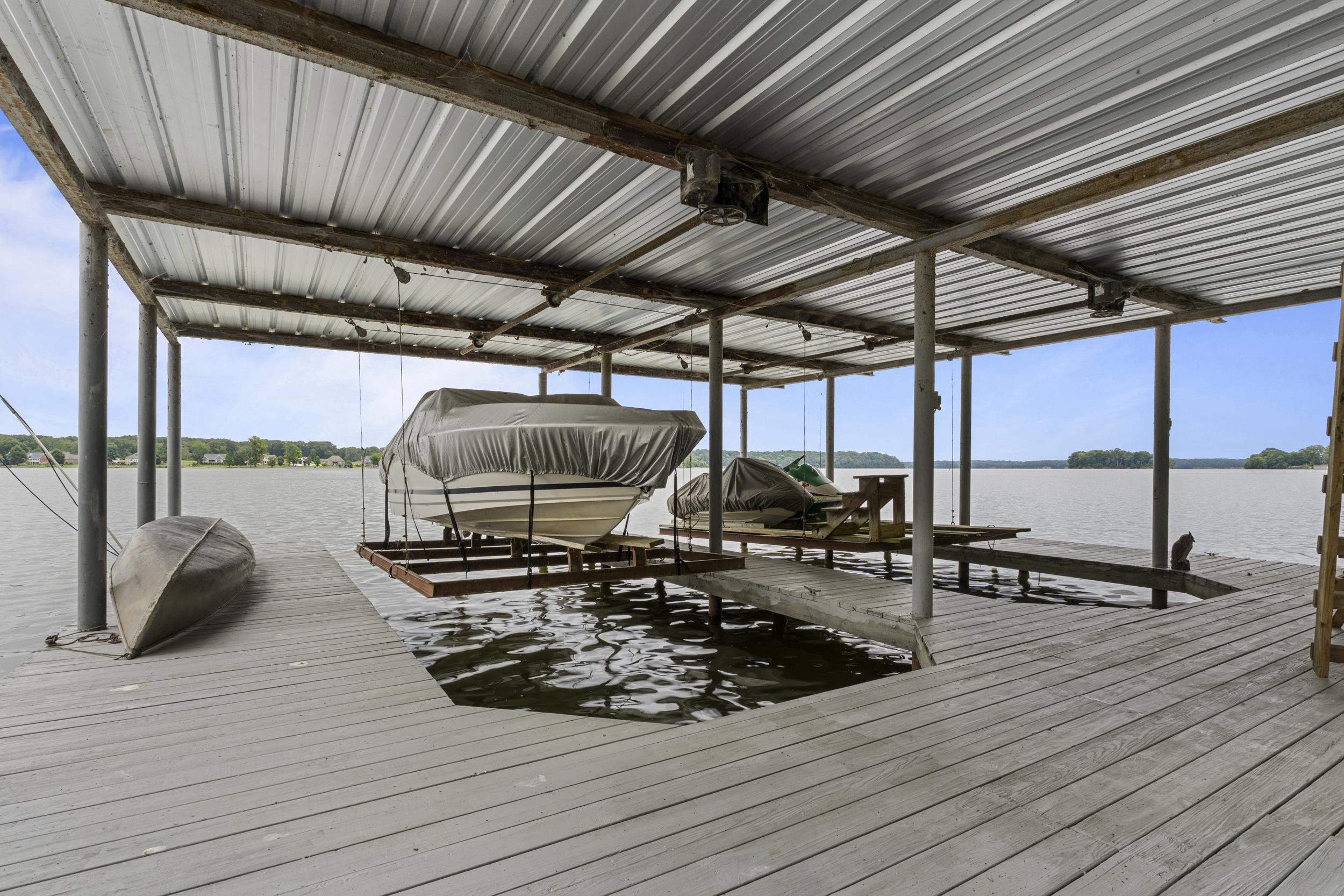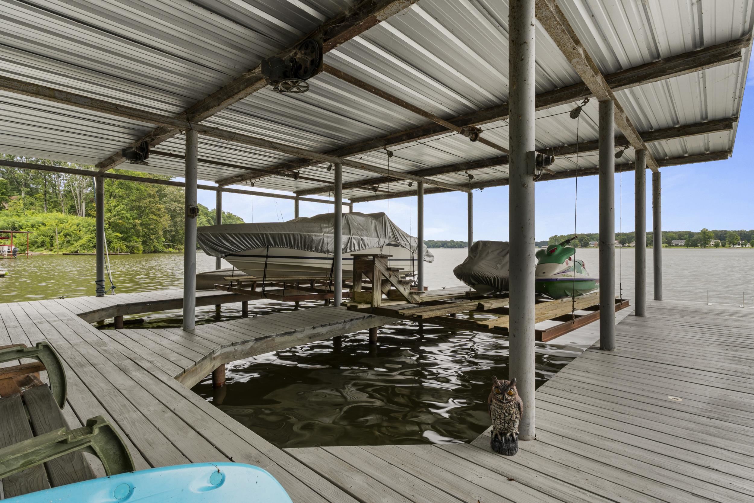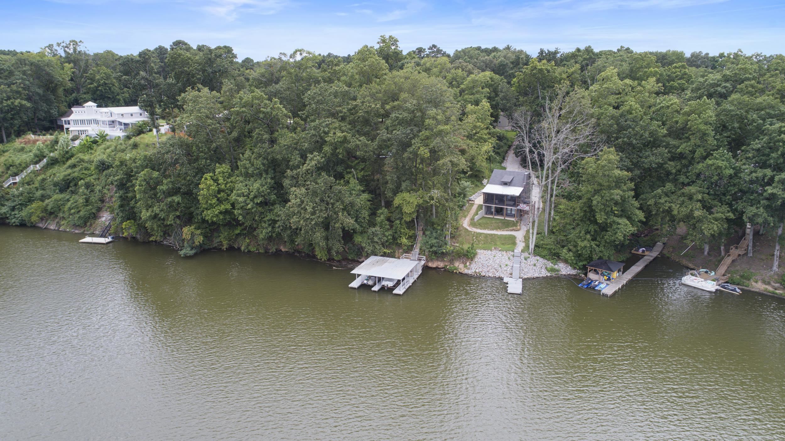 Magnificent deep-water riverfront retreat with stunning panoramic views. This inviting home features a spacious great room open to the kitchen, perfect for gathering after a day on the water. A wrap-around porch and expansive deck—ideal for a hot tub—allow you to enjoy the scenery from every angle. Outdoor living shines with a screened-in porch and generous entertaining spaces. The impressive boathouse includes two boat lifts, a tanning deck, and plenty of room for lakeside fun. Whether relaxing or entertaining, this is river living at its finest.